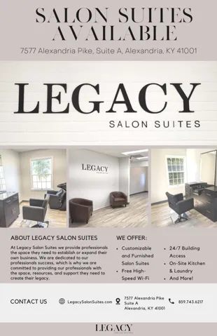 Create your own Legacy! Start or run your beauty business in one of our newly renovated modern Suites in fast growing Alexandria. First Month Rent is FREE with a years lease! Ea. includes styling station, chair & hair washing station, or we can help customize for your needs. The bldg includes 24/7 access & security, high CRI lights, Kitchenette, FREE Laundry & FREE wifi. All utilities included. Offering free small business consulting to help you get your business started. Refer a friend and receive a referral fee! Located in the middle of new construction of retail & 360 Luxury Apts, you’ll have instant clients available!