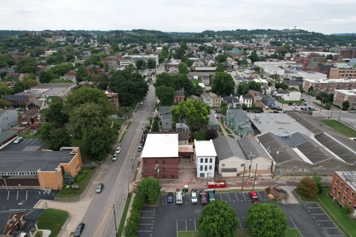A rare opportunity to own a brand-new, high-end brick townhome in the vibrant East Row Historic District—truly the first of its kind! Facing an historic brick street, this stunning three-level residence features soaring ceilings, premium finishes, abundant natural light, and elegant spaces designed for modern living. The lower level offers an entry hall with coat closet and storage, a side-facing two-car garage, and a study or optional bedroom with full bath. The main level boasts an open floor plan with gas fireplace, spacious living and dining areas, a home office, half bath, and walkout to a cantilevered deck. The chef’s kitchen includes an oversized island, quartz countertops, GE Café stainless appliances, and a large pantry. Upstairs, two expansive bedroom suites each offer full baths. The primary suite features two oversized walk-in closets, a double vanity, private water closet, and nearby laundry room. A three-story elevator shaft with electrical hookup is included for optional installation now or later. Built-in smart wiring throughout. Select customizations available during construction. Estimated completion: Q4 2025.