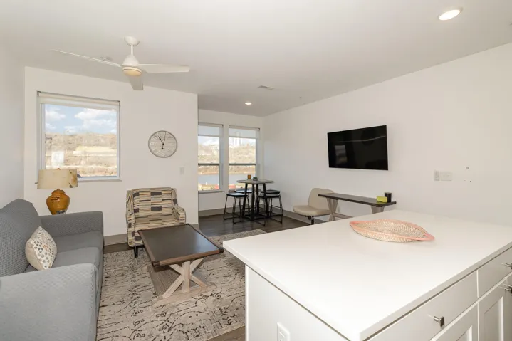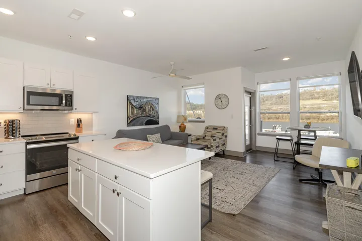 Experience luxurious riverfront living at Gateway Flats in Dayton, KY with the beautifully designed Sanctuary floor plan. This 2 bedroom, 2 bath unit offers a graceful flow from front to back, creating an inviting sense of openness and ease featuring a chef inspired eat-in kitchen boasts a sleek island with a breakfast bar, stainless steel appliances, and an in-unit washer and dryer. Sunlight pours into the bright interiors, leading out to your private balcony with serene views. Residents enjoy access to thoughtfully curated amenities, including a 24-hour fitness studio, scenic walking and biking trails, secure controlled entry, and a pet-friendly atmosphere. Perfectly positioned within the vibrant and evolving Manhattan Harbour, home to a marina and a growing collection of riverfront destinations, Gateway Flats delivers a lifestyle of sophistication, convenience, and attainable luxury.
