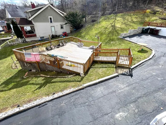 Unique 2 family on large oversized lot! Off street parking for 2-3 cars possibly.* 1st floor unit has 1 bedroom,living & dining rooms & covered side porch area.* 2nd floor unit extends to the 3rd floor -with 3 bedrooms and access to side room-great for an in home office,playroom etc.,with great large window view ! * Both units have access to basement laundry area and storage,* Both units have private entrances.* The tenants have access to large deck,back porch area,horseshoe pit and viewing deck- with woods behind!