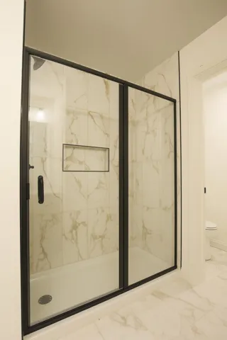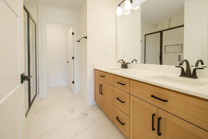 Upstairs, the spacious primary suite offers a true retreat with an incredible fully tiled shower and a walk-in closet. All bathrooms feature elegant tile flooring along with matte black faucets, lighting, and hardware for a sophisticated, contemporary touch.