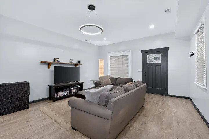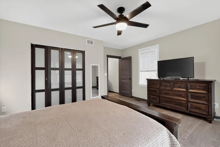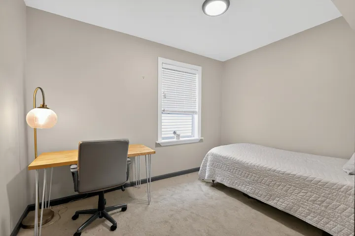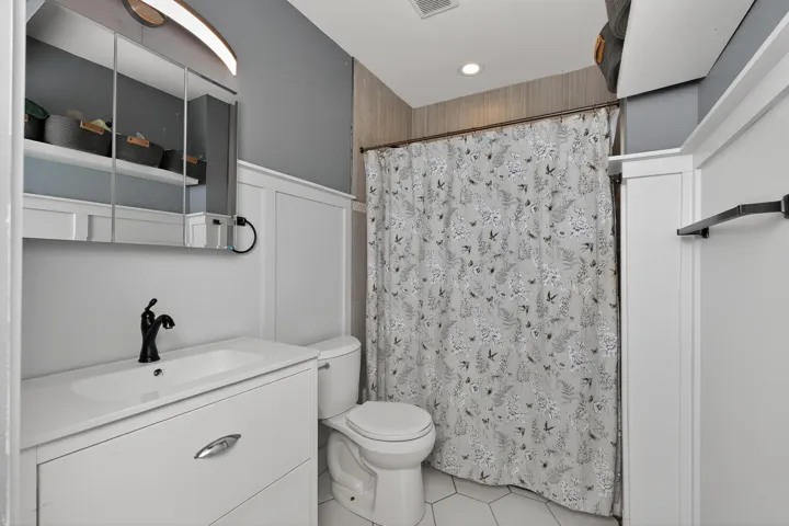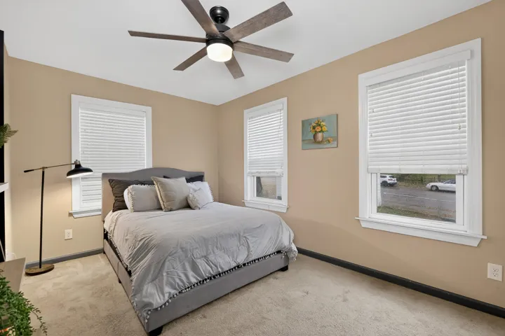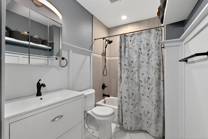 The interior offers multiple walk-in closets for exceptional storage, including a super-sized primary bedroom outfitted with a custom closet organizer to keep everything easily accessible. The renovated bathroom feels bright and fresh with a large vanity, ceramic tile, updated fixtures, and a clean modern look that fits any style. White two-inch blinds throughout add privacy and timeless appeal.