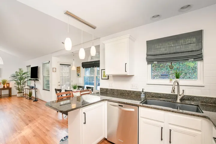 The modern kitchen features granite countertops, stainless steel appliances and a charming breakfast/dining area that opens directly onto a private deck – perfect for morning coffee or outdoor dining. The spacious living room with a wood-burning fireplace creates the ideal setting for relaxation and entertaining.