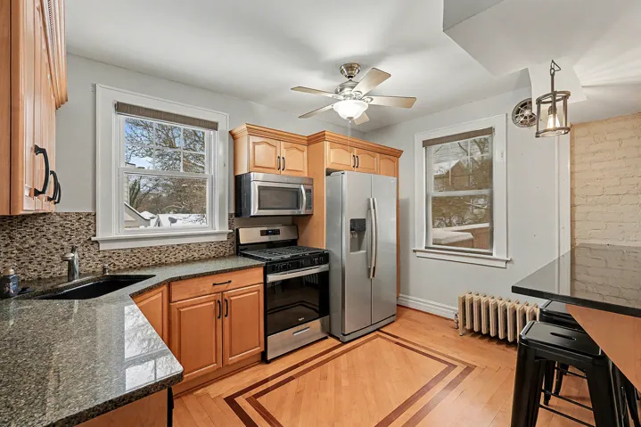 The updated kitchen is fully equipped with stainless steel appliances, granite countertops, and ample storage. Flowing seamlessly from the kitchen in either direction are multiple main-level living spaces, including formal dining and living rooms, as well as an inviting bonus family room—perfect for relaxed, casual gatherings. Step outside from the family room onto the expansive deck overlooking the beautifully fenced, level yard and patio areas, ideal for outdoor recreation and entertaining.