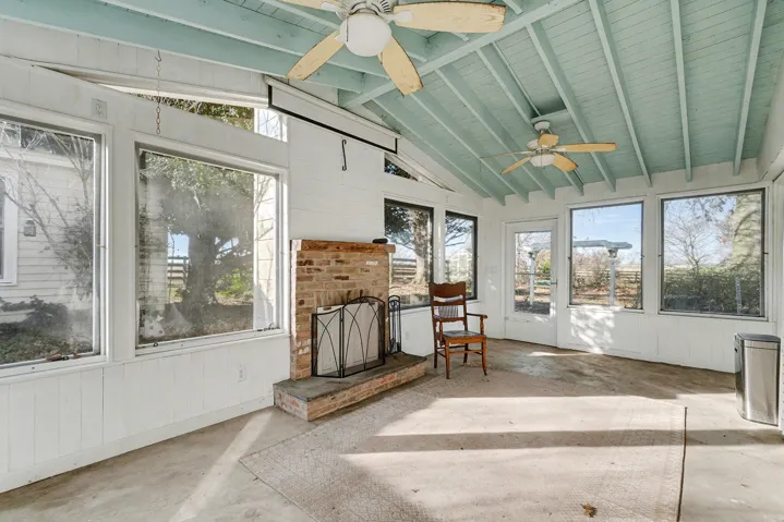 A three-season room with a wood-burning fireplace provides the perfect space for relaxing or entertaining.