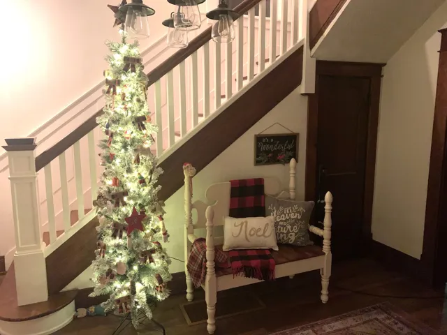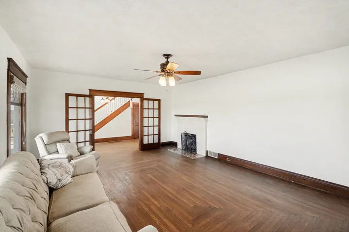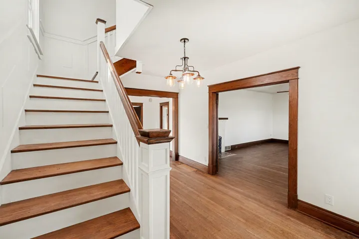 Step inside the inviting entryway showcasing original woodwork that sets the tone throughout the home. A beautiful staircase leads upstairs, while French doors open to the living room featuring a cozy fireplace and stunning leaded glass windows.