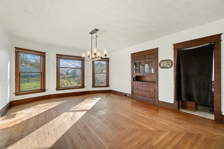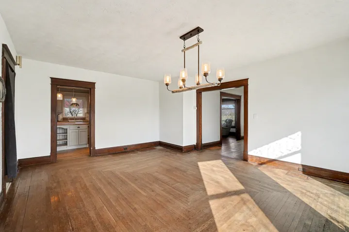 The generously sized dining room is perfect for gatherings, highlighted by wood floors, exquisite woodwork, a leaded glass window, and a built-in cabinet.