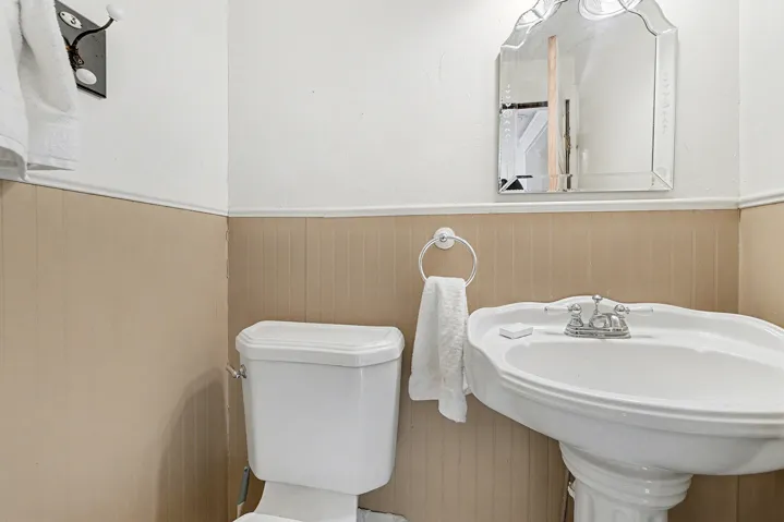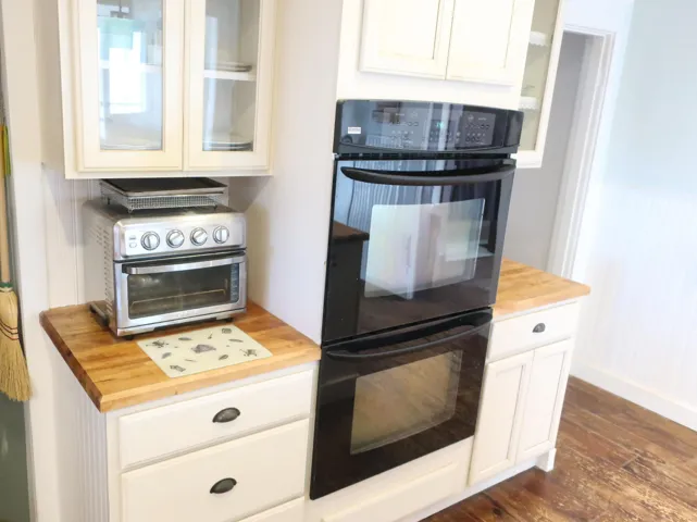 The updated farmhouse-style kitchen is both functional and charming, offering a full appliance package including a double oven and extra freezer, a pantry, a coffee station nook, and a secondary staircase leading to the upper level.